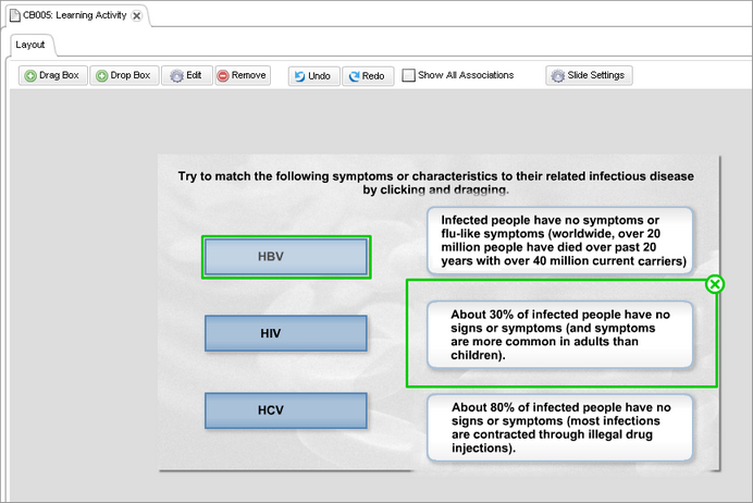 Drag-and-drop slides are used to build learning activities. Drag-and-drop slides contain three unique elements including an instruction box, drag boxes (containing possible answers), and drop boxes (containing questions or images representing questions).