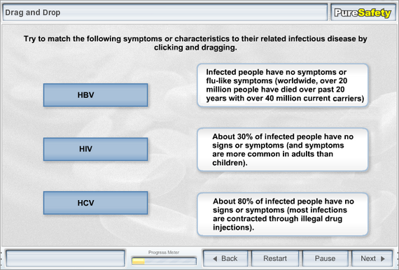 For example, a drag-and-drop slide could contain three drop boxes with unique job titles on each, six drag boxes with unique job functions on each, and the instructions: 'Drag and drop each job function on the appropriate job title.' In this example, a trainee must drag each job function and drop it on the job title that is responsible for that function.