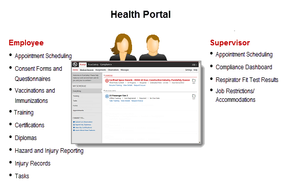 The Supervisor Portal is a component of the Health Portal that allows supervisors access to details about the employees who report to the supervisor such as surveillance compliance, surveillance due information, notifications, mask fit results, restrictions, and accommodations. Supervisors can also schedule appointments on behalf of their employees.