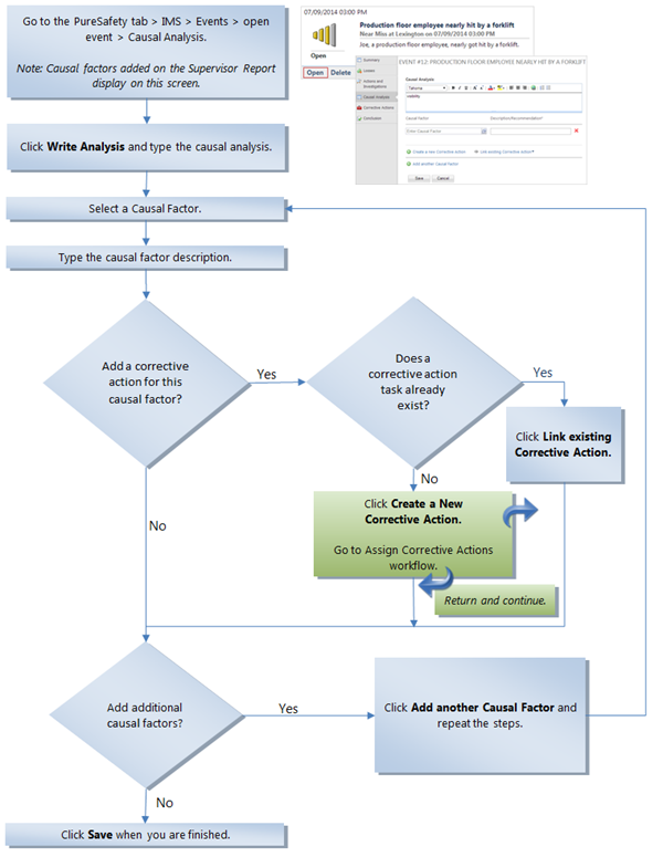 This task presumes that you have created an event, investigated the incident, and need to add information about the factors that led to the incident. From the event record, go to the Causal Analysis screen. Follow the steps on this page.