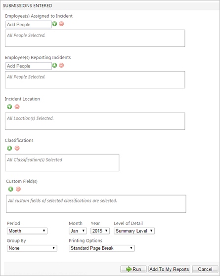 This report provides a list of incident reports and supervisor report submissions that have been entered for the location or locations and date range specified. You can use this report to review and compare your employees' answers to custom fields in incident reports and supervisor reports. This is the only report that allows you to report on specific custom fields and their answers.