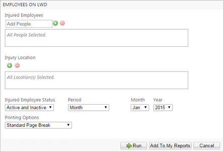 This report provides a list of employees who have lost (LWD) or restricted (RWD) work days in the specified date range.