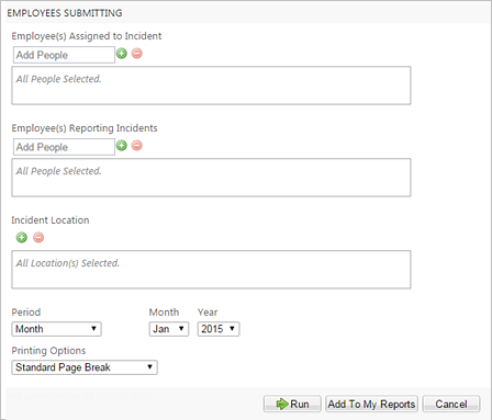 This report provides a list of employees who have submitted basic observations, near misses, and loss incident reports. You can select locations and date ranges.