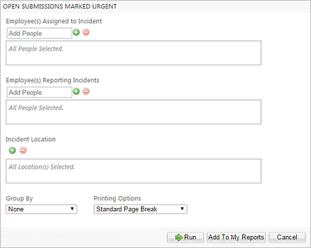 This report provides a list of submissions (incident reports and supervisor reports) that are marked urgent.