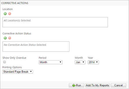 This report provides a list of tasks that have been marked as corrective actions. Use the parameter, Show Only Overdue, to see a list of only the overdue corrective actions.