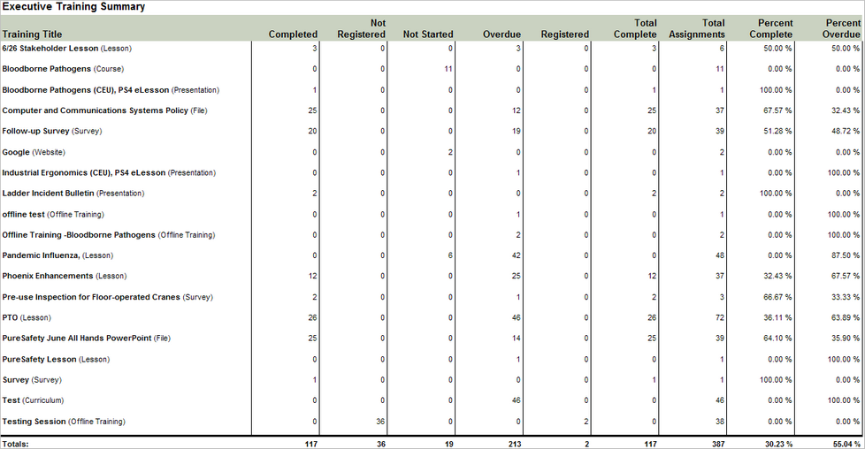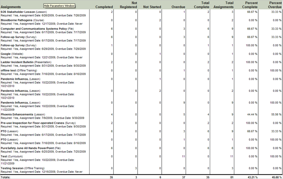 This report provides information on how multiple organization units or groups are following up on their assigned training. The report displays assignment completion statistics for selected employees, organization units, or groups. The report includes all training units and assignments by default. You can include only specific training units or assignments as needed. You can also include certification-type assignments.