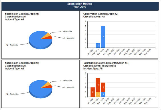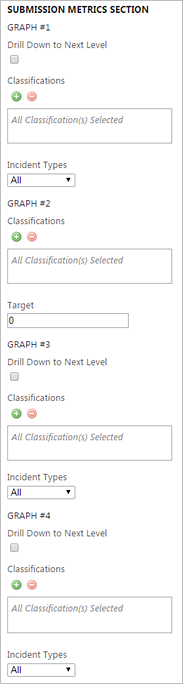 This section displays four graphs of submission and observation counts. Use these graphs to compare submissions with specific classifications and incident types.