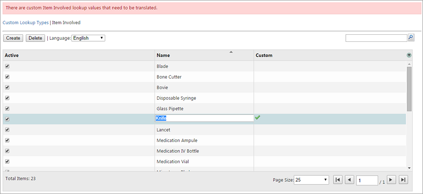 A default set of values is provided for each field. Default and custom values can be marked active or inactive to limit the selection list presented to users in lookup options when reporting a Sharps/BFE injury.