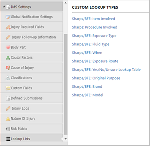 You can create custom values for some of the fields used when reporting a sharps and/or body fluid exposure (BFE) injury. These values displays when an employee reports a sharps/BFE injury in IMS.