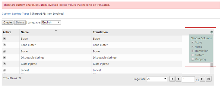 Click the green arrow on the right side of the table to select the columns that display for each custom lookup. This displays only the columns that you need. The Active and Name columns always display. In the example below, the Translation column is selected and displays along with the Active and Name columns.