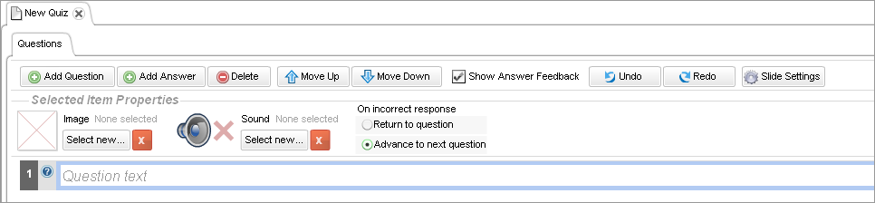 When creating a quiz or test, you must add at least one question. In addition to adding questions, this task also includes instructions for displaying an image with the question, including a sound with the question, and defining the quiz behavior for incorrect responses. After completing this task, you can create answers for the question.