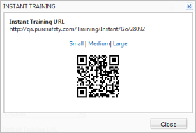 QR Code. Click the link to open a window containing the QR code. This code is specific to the training whose properties are being viewed. QR Codes can be saved and printed in publications, on a piece of machinery, or near a piece of machinery for "on-the-spot" training. Trainees can scan the code with a smart phone or tablet device, login to PureSafety, and begin the training (single training unit assignments), register for training (offline assignments), or add to the home page (courses, lessons, or curriculum assignments).